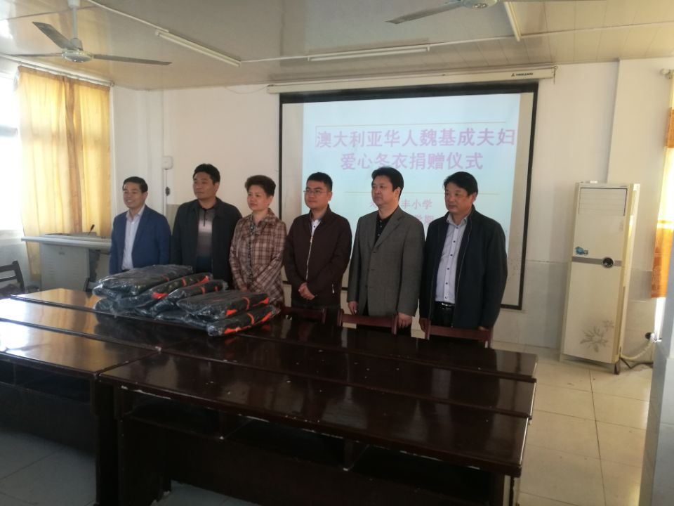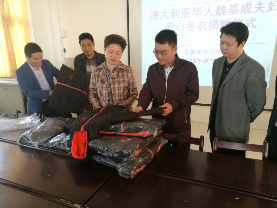 集團公司扶貧幫扶村壽縣安豐鎮(zhèn)甲貝村是重點貧困村,安豐小學位于安豐鎮(zhèn)甲貝村境內(nèi),在校學生2025人,貧困學生113人。安豐鎮(zhèn)黨委政府和集團公司駐村工作隊重視僑界資源,積極與市縣僑聯(lián)對接。2018年,在市僑聯(lián)的關心幫助下,爭取到澳大利亞籍華人魏基成夫婦基金會捐贈愛心冬衣192件,價值3萬余元。