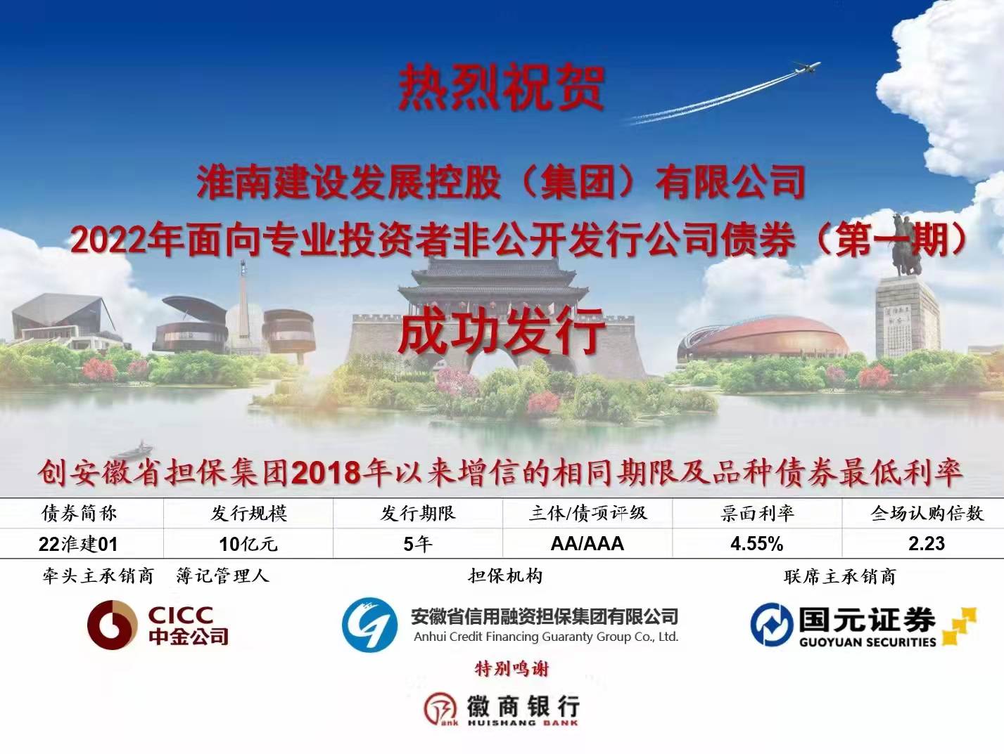 1月12日,建發(fā)集團成功簿記發(fā)行公司首單非公開發(fā)行公司債券,債券簡稱:20淮建01、發(fā)行規(guī)模10億元、票面利率4.55%,安徽省擔(dān)保公司對債項增信擔(dān)保,認(rèn)購倍數(shù)達(dá)2.23倍。